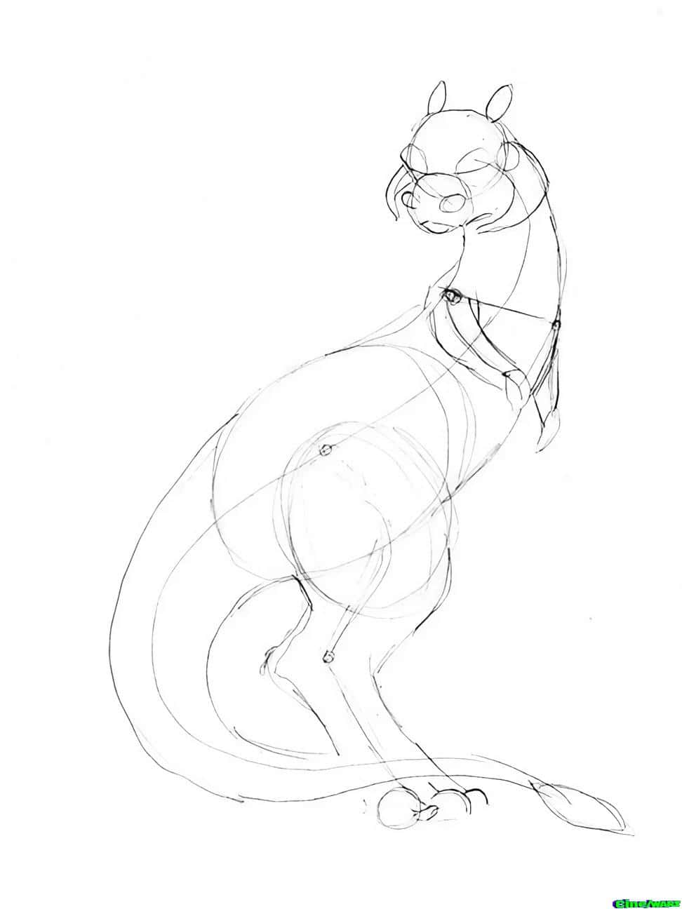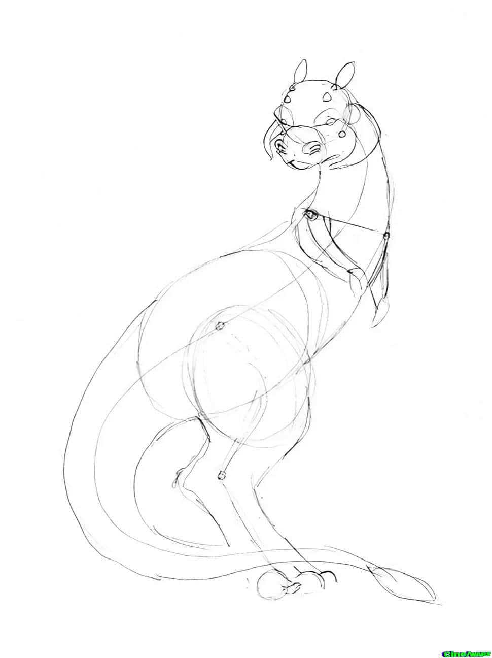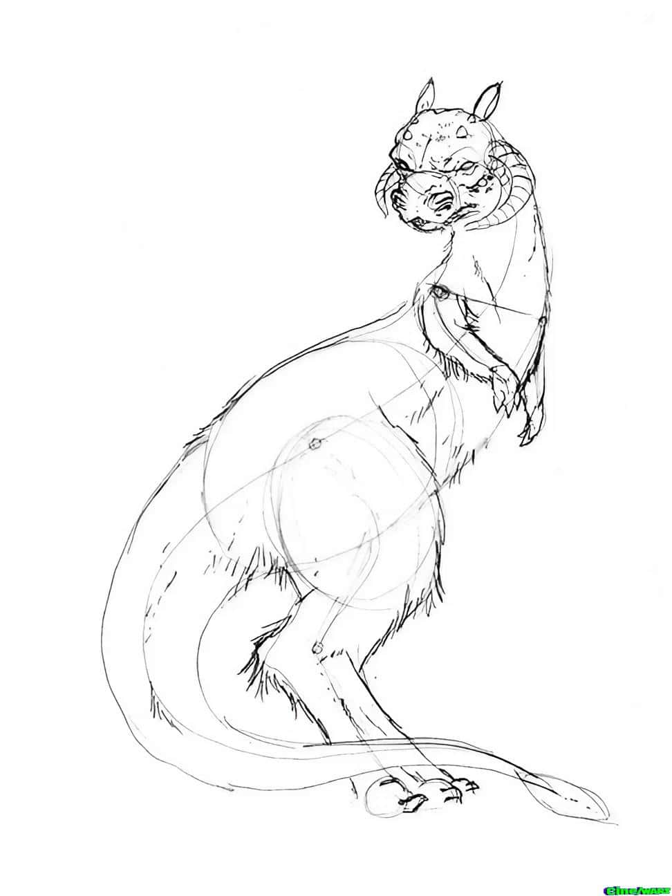 Now it’s time to start filling out the body shape. Add the lines for the tauntaun’s outer neck, belly, leg and tail. Don’t forget the little spade shape on the end of the tail.