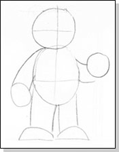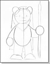 Draw a circle for the head and a tall oval for the body. Next draw a straight line up and down through the middle of the head and body. Then make a horizontal line through the center of the head and one through the center of the body. Next draw a line underneath the oval about the same height as the head so the Ewok stands on solid ground.