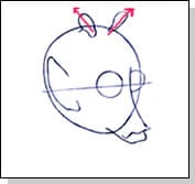 Here you’re going to draw those funny little ears on top of his head. The shape very much resembles that of kidney beans. Watch the direction. As with his ear, they’re slanted, not straight up and down. When drawing his mouth, think of a soft, curvy ‘W’ shape. Draw his lower lip, extending the into the egg shape as it becomes his jaw.