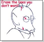 Begin erasing any stray lines that you are confident you don’t want. For example, the horizontal line you drew in Step One, or any other marks that you don’t want in the final drawing (such as the ones indicated with the red arrows).