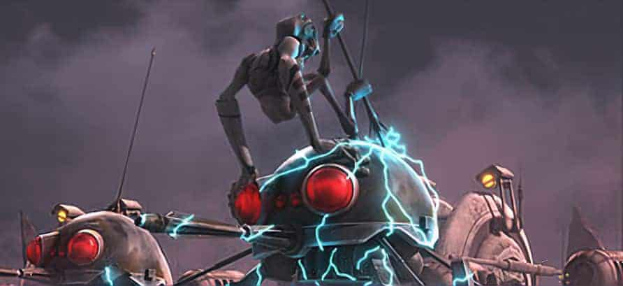 Clone troopers and Dug cavaliers riding insectomorphs hold the droids off while Republic Y-wing bombers scramble. ARC-170 fighters flank the lead bomber that carries the payload. The electro-proton bomb free-falls into the thick of the droid ranks, releasing an enormous blast. A wave of electromagnetic energy sweeps past the droids and clone forces, disrupting all technology in its wake: the droids are crippled, the clone helmets get momentarily frazzled — even Anakin’s mechanical arm briefly fritzes.