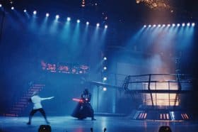 [Kael] gets back on his horse and rides off and Willow’s discovered out in the house, and he grabs the girl and pulls her out and brings her up on stage and she’s got a baby. And that’s the baby that the evil queen in Willow wants. This is the setup of the whole show. He brings her up on stage and suddenly they’re visited by this spirit, this fairy that appeared in Willow, and she speaks to them and says ‘We’re looking for a hero to protect us. There’s a dark force coming. And you’ve been chosen to find that hero. Take this wand’–and magically this wand appears. ‘And use it on your journey. It will help you.’“Massive set changes, which regularly exchange one set of towering scenery for another, allow Hiromi and her magic wand to travel through Lucas’ films worlds, some emphasizing grand setpiece moments over familiar narratives. A looming castle with a working drawbridge dominates the Willow set. In the world of American Graffiti, dancers dressed in their best 1950s sock hop outfits twirl across the stage as a giant jukebox towers 15 feet above their heads.