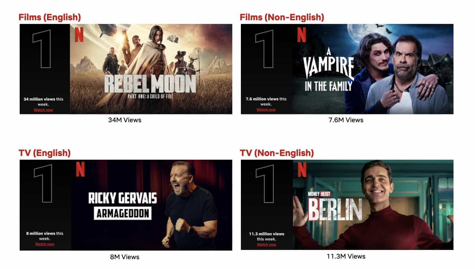 Stand-up specials had a strong showing this week over on the English TV List. Ricky Gervais: Armageddon debuted at #1 with 8M views, Dave Chappelle: The Dreamer opened at #5 one day after its premiere (2.2M views) and Trevor Noah: Where Was I landed at #8 (1.7M views). Teen romance drama My Life with the Walter Boys spent its fourth week on the list at #2 (5.4M views), while the sixth and final season of The Crown held its reign at #3 (3.6M views).