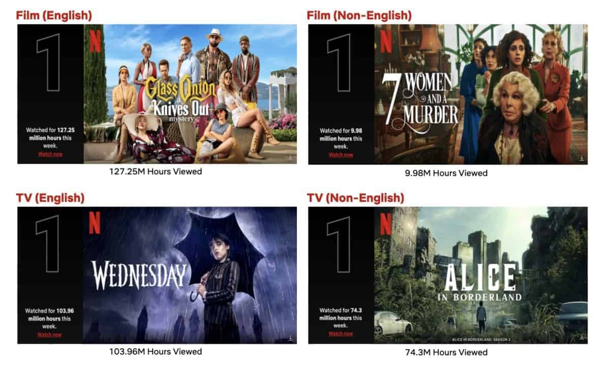 On the Non-English TV side, Japanese dystopian thriller Alice in Borderland took the top two spots on the list with 30.22M hours viewed (Season 1) and 74.3M hours viewed (Season 2). This week marks the most hours viewed in a week for a Japanese series. New entrants on the list include Korean drama The Glory (25.41M hours viewed) and Mexican dramas Daughter From Another Mother (22.49M hours viewed) and Season 3 of La Reina del Sur (22.41M hours viewed). Other Korean titles including drama Alchemy of Souls (Part 2) and reality dating competition Singles Inferno returned to the list, along with Colombian dramas The Unbroken Voice and Til Money Do Us Part.