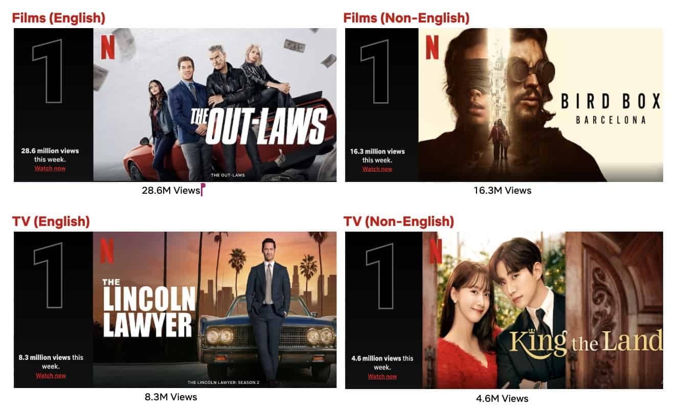 Fans continued their viewing spree of the bank heist film The Out-Laws – starring Adam Devine, Nina Dobrev, Ellen Barkin and Pierce Brosnan – as it nabbed the #1 spot on the English Films List for the second week in a row with 28.6M views, making it the most viewed title this week. Extraction 2 remained on the list for the fifth week in a row at #4 with 5.2M views. Fans can’t get enough of animated feature Nimona which held strong at #5 (4.7M views) while the new documentary Unknown: Killer Robots debuted on the list at #10 (2.7M views).