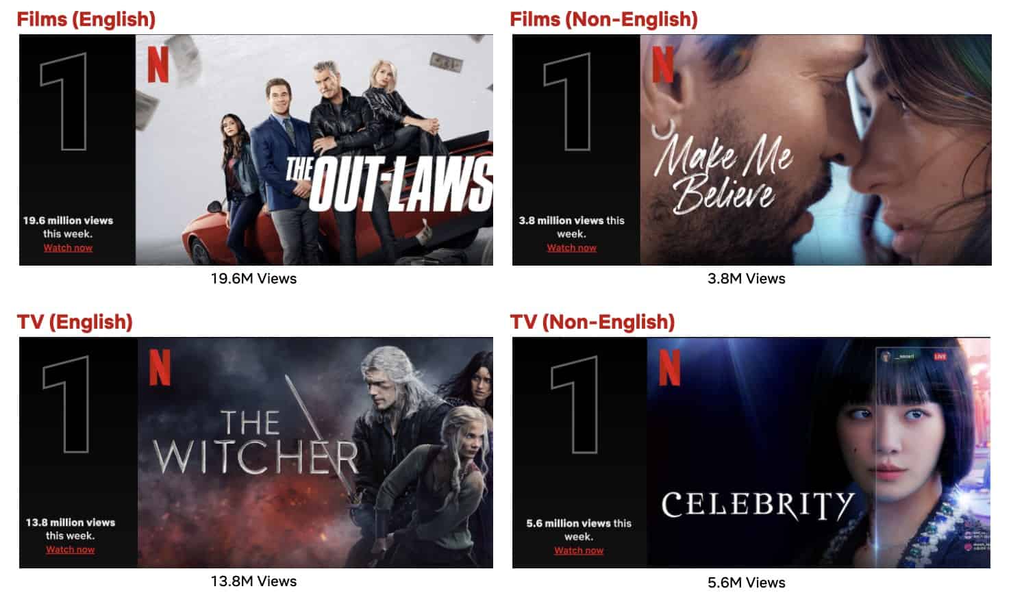 On the Non-English Films List, Turkey’s rom-com Make Me Believe climbed to #1 with 3.8M views, while India’s Lust Stories 2 jumped to #3 (3M views). Spain’s Through My Window: Across the Sea remained on the list at #4 (2.6M views) as the original film Through My Window landed on the list for its 16th time (0.9M views). Returning to the list were Danish drama A Beautiful Life, South African heist drama iNumber Number: Jozi Gold and Dutch drama Faithfully Yours.
