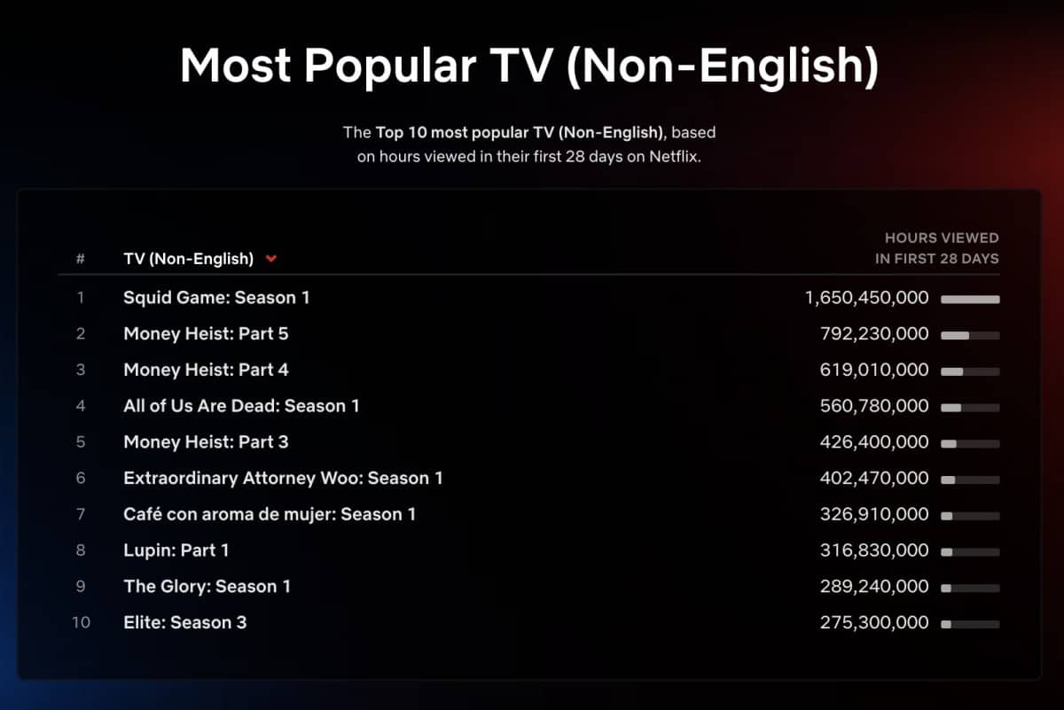 On the English TV List, audiences explored the unsolved tragedy in docuseries MH370: The Plane That Disappeared, which had 59.88M hours viewed and landed in the Top 10 in 86 countries. Fans continued to travel to Outer Banks as Season 3 pulled in an additional 44.58M hours viewed this week. Since its debut, this season has amassed more than 33M views (298.6M hours viewed divided by 8.9 runtime hours). Seasons 1 and 2 also remained on the list along with the second seasons of Sex/Life and Next in Fashion and Season 1 of Perfect Match. Chris Rock brought the laughs as Selective Outrage landed in the #8 spot with 17.79M hours viewed.