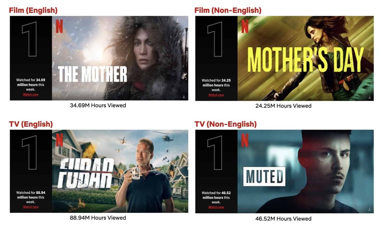 Action reigned this week as Netflix’s Chief Action Officer Arnold Schwarzenegger brought the heat as FUBAR, created by Nick Santora, debuted in the #1 spot on the English TV List with 88.94M hours viewed, making it the most viewed title this week. With over 12M views (88.94M hours viewed divided by 7.13 runtime hours), the action-comedy, which is Schwarzenegger’s first-ever TV series, appeared in the Top 10 in 90 countries. And Jennifer Lopez’s The Mother kept the action going on the English Films List where it was #1 for the third week in a row with 34.69M hours viewed. With 212.8M total hours viewed, the action-thriller now has over 108M views (212.8M hours viewed divided by 1.96 runtime hours).