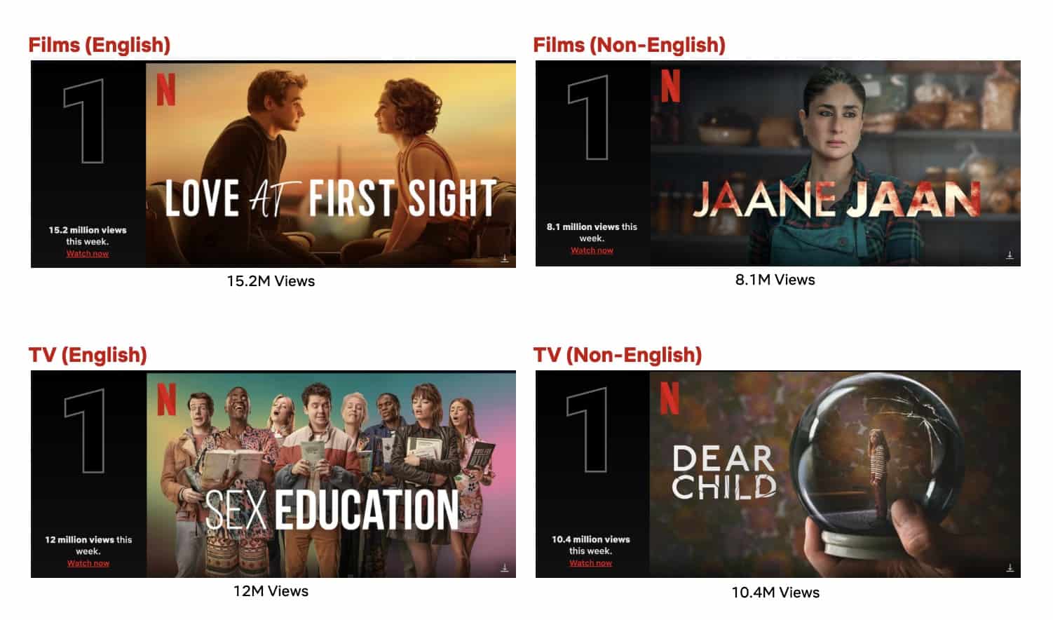 The new Indian thriller movie Jaane Jaan, starring Kareena Kapoor, debuted atop the Non-English Film List with 8.1M views, along with new Spanish drama How to Deal With a Heartbreak, which debuted at #7 (1.1M views). Returning favorites dominated the remainder of the list with Danish period romance Ehrengard: The Art of Seduction coming in at #2 (3.8M views), Japanese family comedy Once Upon a Crime taking the #3 spot (3.5M views), followed by Spanish documentary Rosa Peral’s Tapes at #4 (2M views), Polish hip-hop action thriller Freestyle at #5 (1.8M views), Chilean dark comedy El Conde at #6 (1.4M views), and Mexican drama The Great Seduction at #10 (0.8M views).